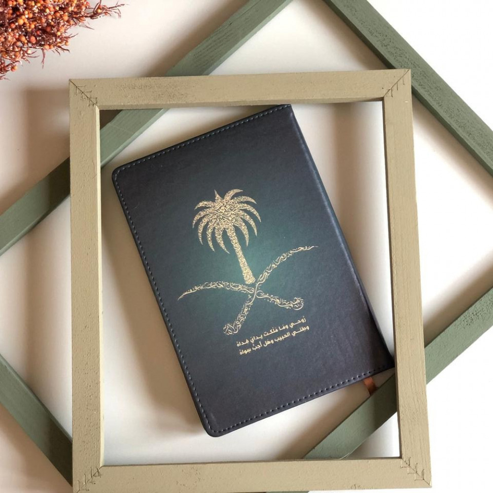 مذكرة جلد فاخر ، منقوش بخط عربي بعبارة (روحي وما ملكت يداي فداه وطني الحبيب وهل احب سواه )على السيفين والنخلة ، تجسيدا وتعزيزا للهوية الوطنية السعودية.